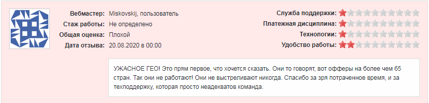 Miskovskij остался крайне не доволен ГЕО. Он утверждает, что офферы в большинстве странах не работают, а техподдержка, просто неадекватная команда.