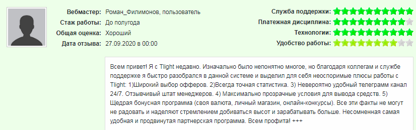 Роман Филимонов во время работы с сервисом, для себя выделил следующие плюсы: точную статистику, чат в телеграмме, большой выбор офферов, условия для вывода средств.