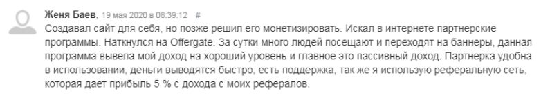 Евгений Баев поднял доход, сотрудничая с Offergate. Он решил монетизировать собственный сайт с помощью баннеров. Особенно автор отзыва отмечает реферальную систему и пассивность дохода.