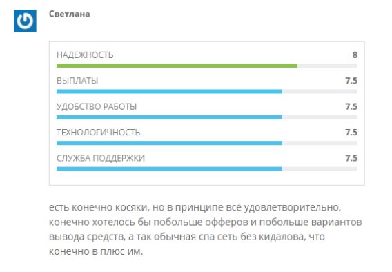 В целом Светлана отзывается положительно. Однако ей хотелось бы по больше офферов и методов вывода. Светлана пишет, что работает без «кидалова».