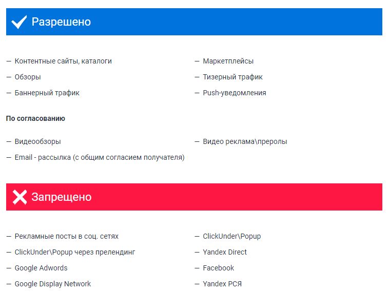 - модель оплаты — СРА, CPM, CPL, CPS, RevShare;