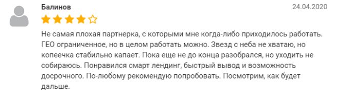 Балинов не до конца разобрался с сетью и считает ее не хуже и не лучше других. Он оценил досрочные выплаты, смарт-лендинг, стабильность дохода в CPA-сети.