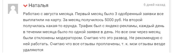Наталья обвиняет администрацию шейве и считает, что положительные отзывы проплачены. Ее обманули на второй месяц работы — все лиды за 30 дней работы отклонили.