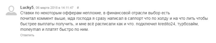 Лакки 5 перед началом работы не поленился, проконсультировался у саппорта о правилах CPA-сети. Подключился к нескольким финансовым офферам — тут ему понравились ставки, возможность быстро получить выплату.