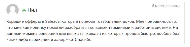 У Нила остались положительные впечатления о Saleads. Особо он отметил, что ему как новичку подсказали, как работать в системе. Вебмастер получил 2 выплаты без нареканий по срокам.