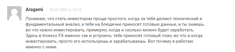 В следующем отзыве Aragami пишет, что торговать с мощной поддержкой брокера не сложно. Трейдеры из команды Invesco FX взяли капитал инвестора под управление, и теперь он получает прибыль, не заморачиваясь с аналитикой и изучением нюансов торговли.