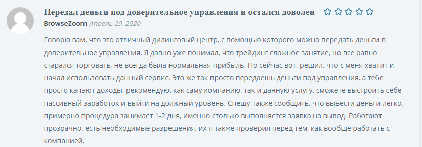 Данный отзыв посвящен доверительному управлению у брокера. Пользователь Browsezoom давно торгует и понимает, что трейдинг — рискованное дело. Реальная прибыль не всегда соответствует ожиданиям. С сервисом Invesco FX все просто: отдал деньги и получай пассивный доход. Фирма работает не первый год, вывод средств — через 1-2 дня после подачи заявки.